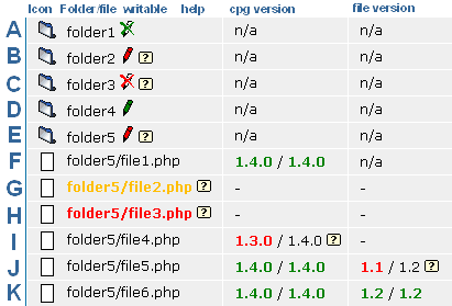 Please note: as there have been changes both in the coppermine files and the database from cpg1.3.0beta to cpg1.3.0 (final) and then on to cpg1.4.x, users of the beta will have to apply all steps mentioned above: both the files have to be replaced and the update.php script has to be run once. 3.5 The version check toolSince the release of cpg1.3.2 Coppermine comes with an additional version checking tool to help you resolve issues with upgrades and updates easily. Except for specific files of coppermine that will only work for the version that it had been originally designed for, the versioncheck tool can be used with all versions starting from cpg1.2.1. To launch the versioncheck, simply add versioncheck.php to your browser's address bar after being logged into coppermine as admin (example: http://yourdomain.tld/your_coppermine_folder/versioncheck.php). With version 1.4x, you can run the versioncheck utility from the Admin Tools menu. 3.5.1 What it doesThe script "versioncheck" is meant for users who have updated their coppermine install. This script goes through the files on your webserver and tries to determine if the local file versions on your webserver are the identical to the ones at the repository of http://coppermine.sourceforge.net. Files that do not match are displayed and are the files you should update as well. In Cpg1.4.x you can toggle the URL to the latest update for individual files in the versioncheck page. It will show everything in red that needs to be fixed. Entries in yellow need looking into. Entries in green (or your theme's default font color) are OK and should be left alone. When an entry is red or yellow, a help icon will appear next to it. Click it to find out more. Hovering with your mouse over an item will display additional information as well (tooltip). The versioncheck screen has several sections: